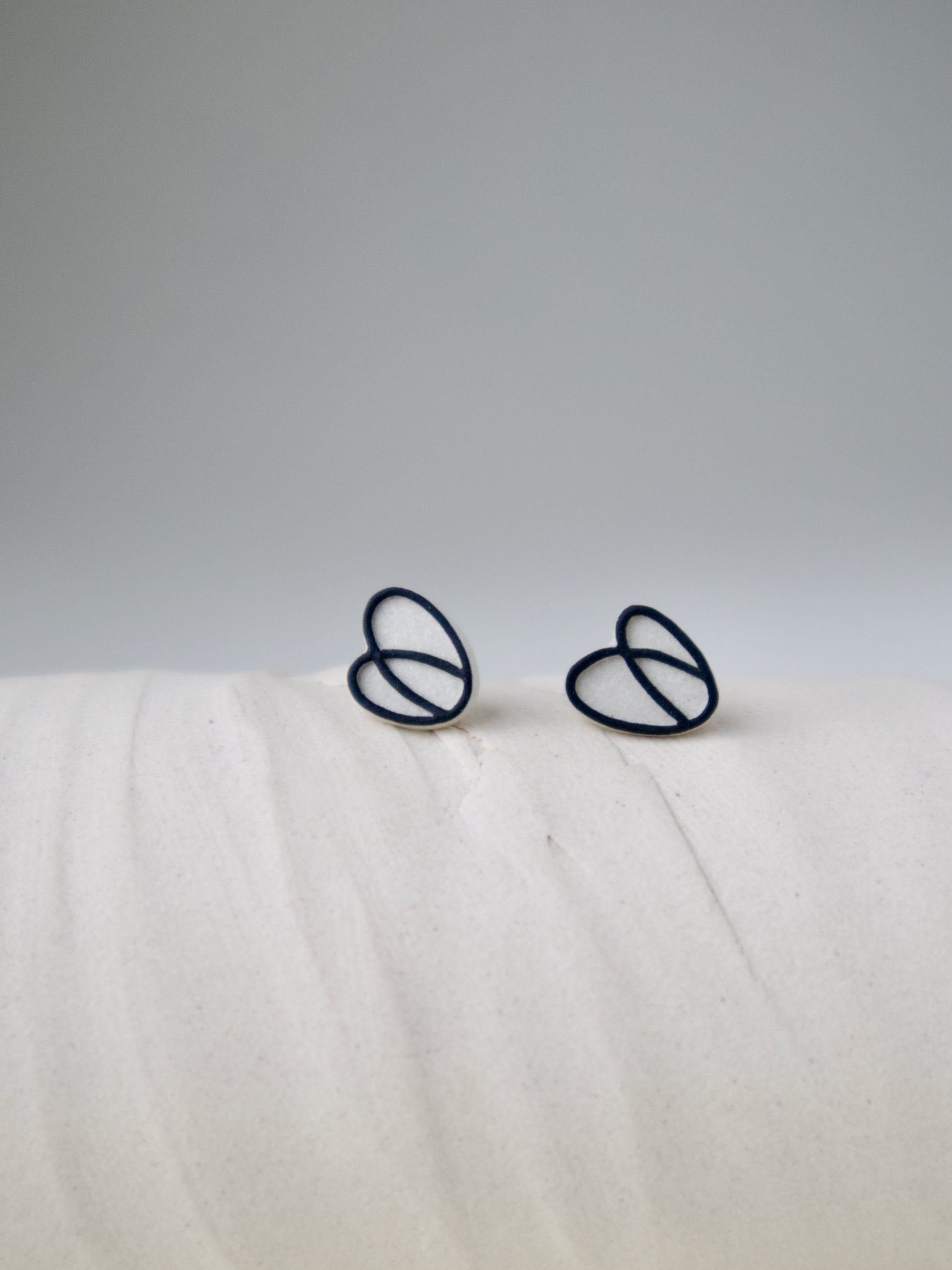 These understated stud earrings showcase the raw beauty of handcrafted stoneware. Each piece features an original hand-carved stamp design pressed into clay, forming an abstract tulip shape. The crisp black underglaze contrasts beautifully against the natural clay, while the raised linework creates subtle dimension and shadow. Reminiscent of both a simplified bloom and a modern interpretation of a heart.